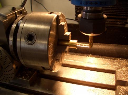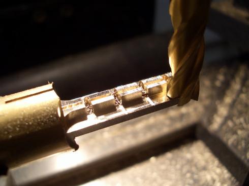 Auf der Fräsmaschine im Teilapparat wurden nun alle Bohrungen, Gewinde und die Außenkontur erstellt. Zwischen den einzelnen Teilen muss ein Maß X für den Sägeschnitt mit berücksichtigt werden. Anschließend wurden die Teile mit kleinen Schrauben fixiert, damit nach dem Abtrennen der einzelnen Teile nicht auseinanderfallen.