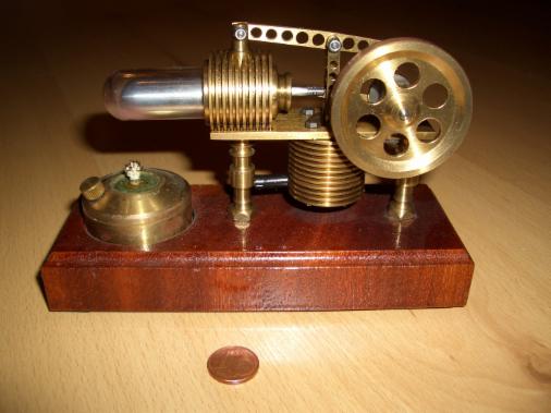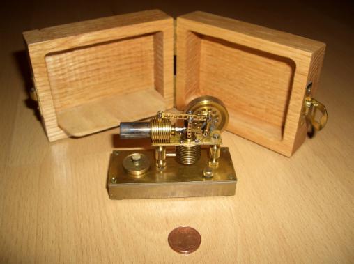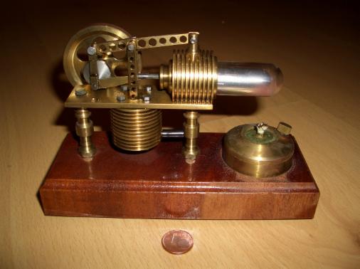 Der zweite Stirlingmotor ist eine Kopie des ersten, jedoch in einem um die Hälfte verkleinerten Maßstab (…ich mag es klein und handlich…). Am Anfang wollte ich das Modell als Wärme- oder Kältemaschine antreiben, da das Verhältnis zwischen Fläche und Volumen bei einer exakten Verkleinerung nicht stimmt, sollte der Motor eigentlich aus eigener Kraft nicht laufen. Doch es war einen Versuch wert, auch diesen Motor mit Spiritus zu befeuern und siehe da, das Biest läuft besser als der erste nach Bauplan gebaute Motor… nur soviel zu Theorie und Praxis…