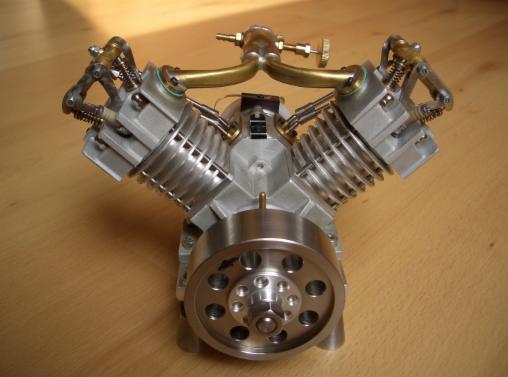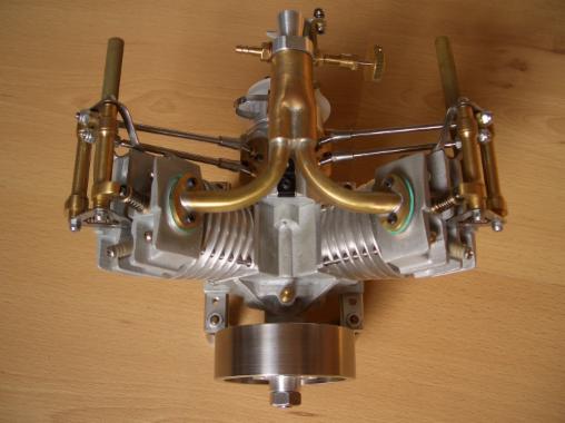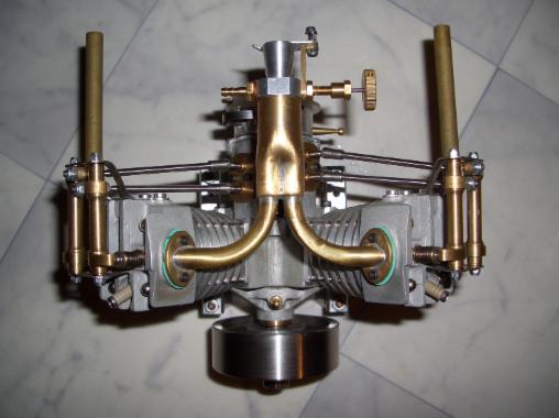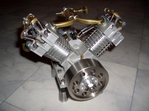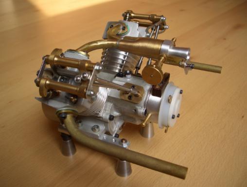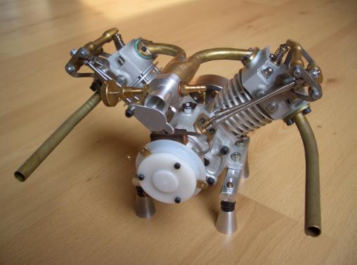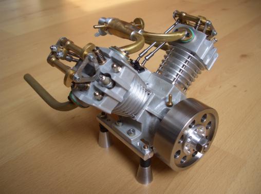 Mein momentanes Bauprojekt befasst sich mit einem 2-Zylinder 4-Takt V-Motor 90° mit offen liegenden Ventilen und dazugehörigen Stößelstangen. Der Bauplan, der von der Firma Ravensburger Dampfmodelle vertrieben wird, zeigt einen Flugzeugmotor aus dem Jahre 1920-1930.